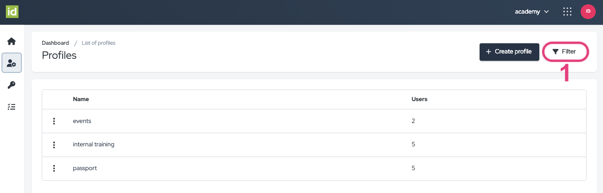 Navigate to the Profiles section of the Identity Module. Here, you'll find a comprehensive list of the available profiles on the account, along with the corresponding number of users assigned to each profile.
